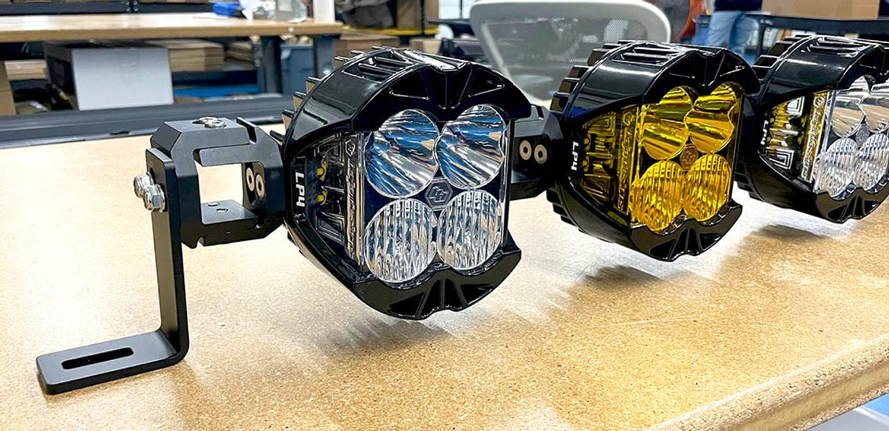 A set of Baja Designs LP4 Pro LED auxiliary lights mounted on a bar.